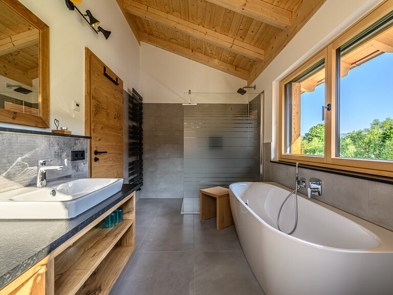 Das Badezimmer im Obergeschoss verfügt über eine ebenerdige Dusche und eine Luxusbadewanne, ein WC, ein Waschtisch mit zwei Waschbecken und ein Handtuchheizkörper.